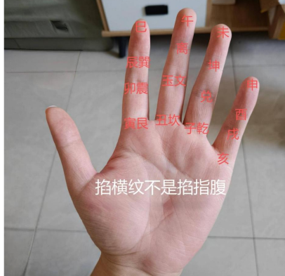 ②“唵(子)吽(午)吒(卯)利(酉),破(玉文)!”=念到最后这几字时,要用大拇指分别掐子午卯酉。最后掐到中间的玉纹喊“破”并打出去。掌诀如图: