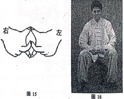 1.接上式。双手结“龟蛇诀”(左中指曲盘在左食指背中间,左无名指、小指自然屈于掌心,左拇指伸直;右手势同左手,然后两食指尖指腹相贴,两拇指尖对应相贴。图15)或“圆灵诀”于小腹前,两掌侧、腕部轻放在左右大腿根上(图16)。