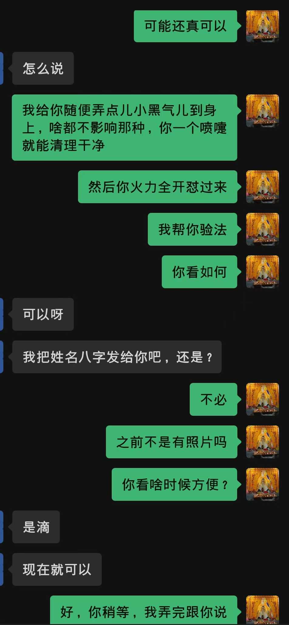 此阶段模仿真实斗法+斩邪师的情况。比如咱先给老铁弄一股小黑气儿过去、凑成“祖师爷!是人家先打我”的触发条件,然后老铁请阴师+兵将们火力全开反击来。