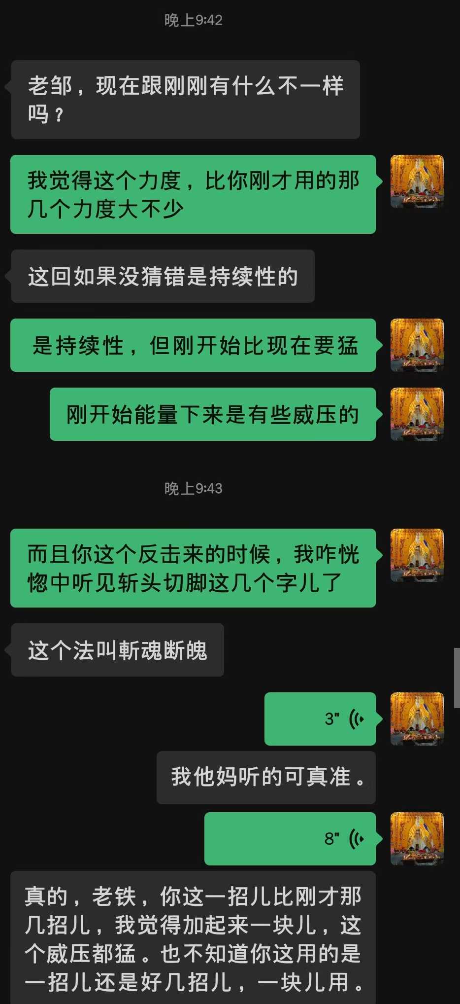 ①打来时,耳朵里很明显的听见“斩头切脚”四个字。问后知道这招叫斩魂断魄,内含阴剑斩魂、退掉家神等效果,是个复合法。