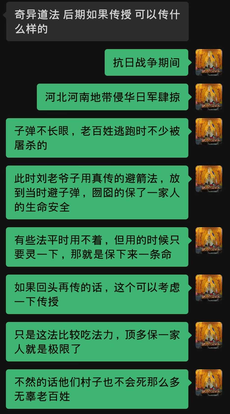 家传的奇异法很多,几乎都是当年祖上亲自用过且灵验的。诸如:九龙飞剑大法、变身法、撒土成桥、草席飞天(可带人)、肉身飞天、挥手化屋、莲藕化人等等。但我们现在没修出来,就先不传了。可话先说到前头:但凡练出来并当面表演出来,想学7位数起。当年太姥爷的徒弟侯希贵,据传给李嘉诚表演隔空搬运后润金二三百万元港币,那个年代尚且如此丰厚,何况今日?