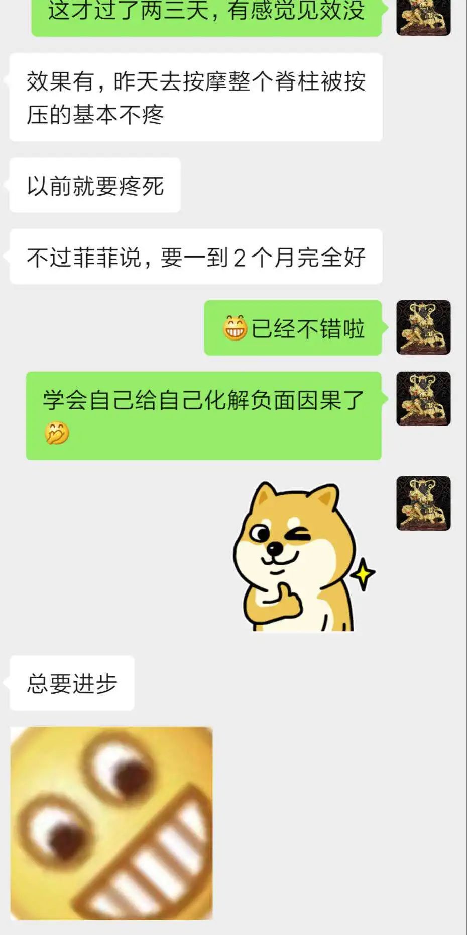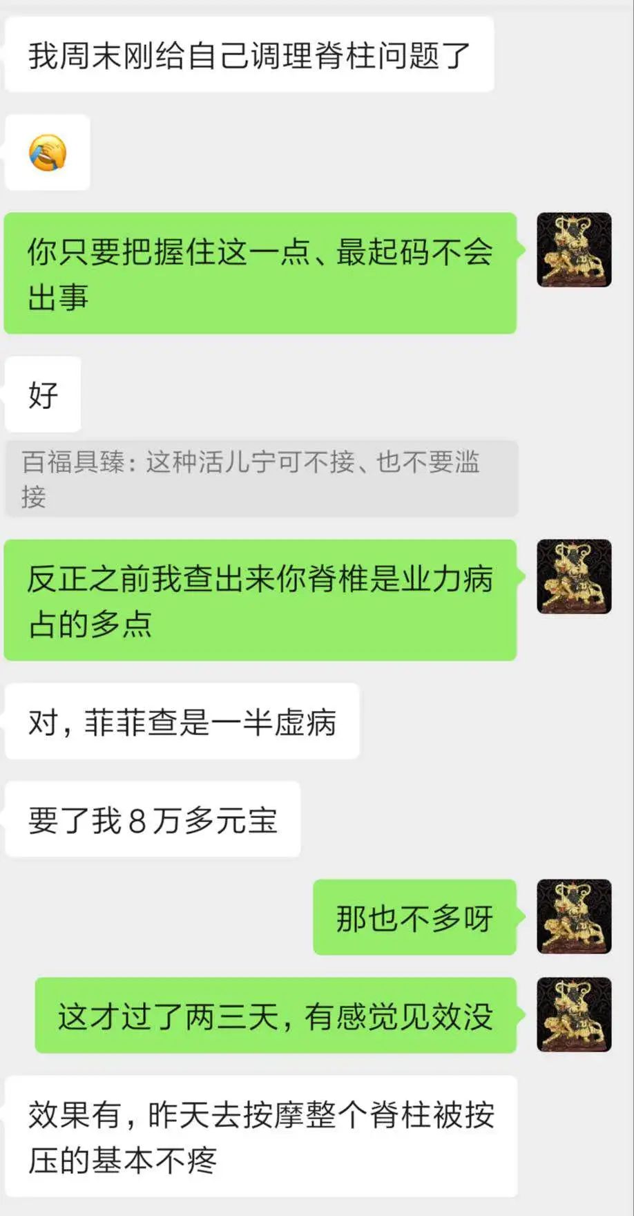 老戴同学得知缘由后,做了一番深刻忏悔,并用法脉传授的化解因果方法、自己给自己还阴债处理。你还别说,不到3天立马就有效果了: 原本去按摩店推拿疼的要死,但化解之后再推拿时基本不痛了,并且最近明显感觉后背在恢复。