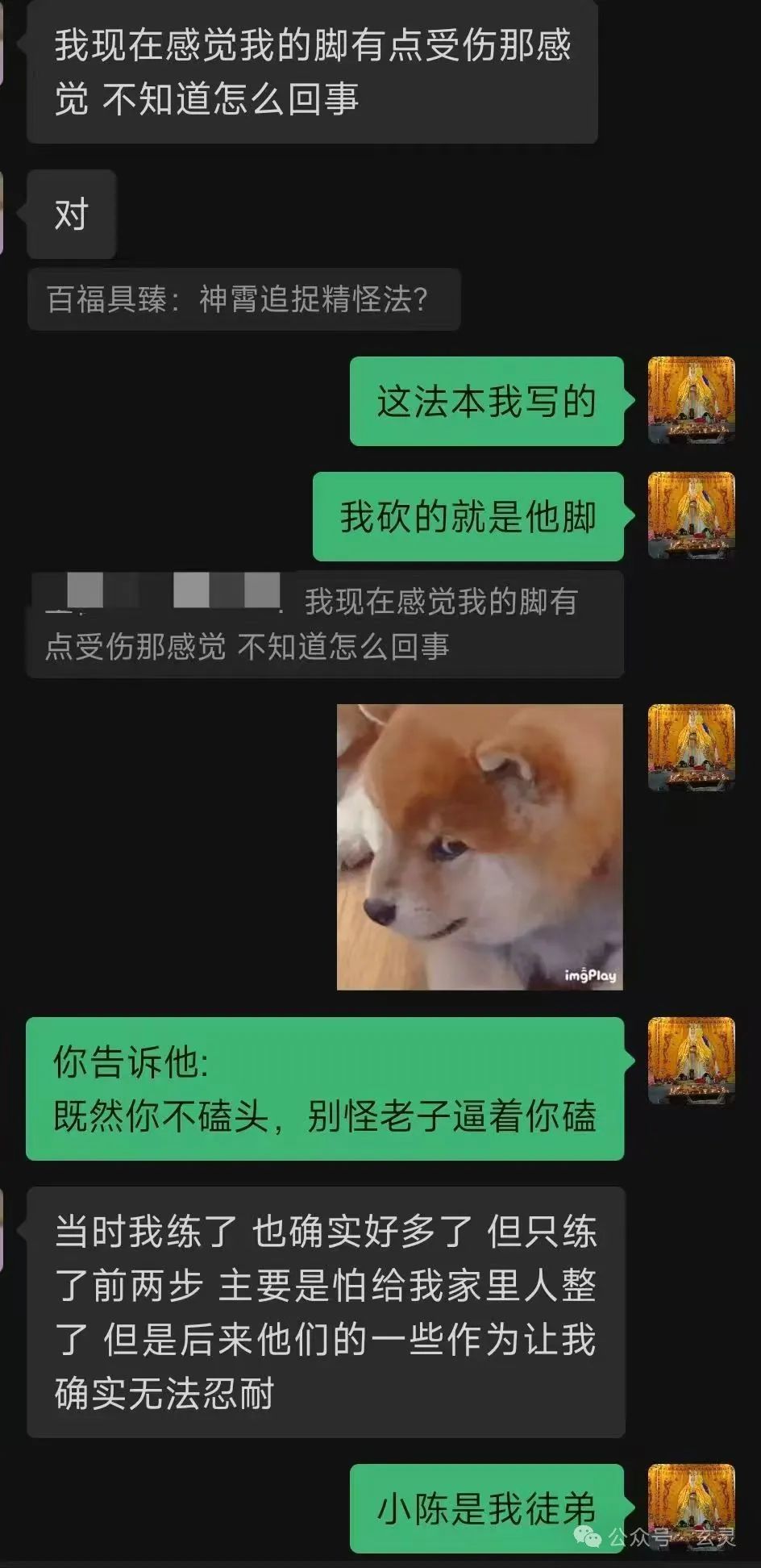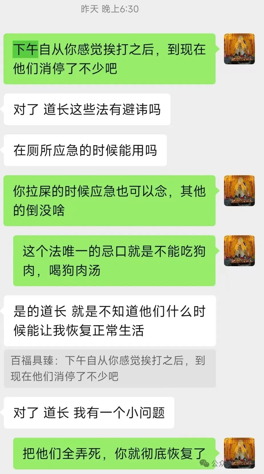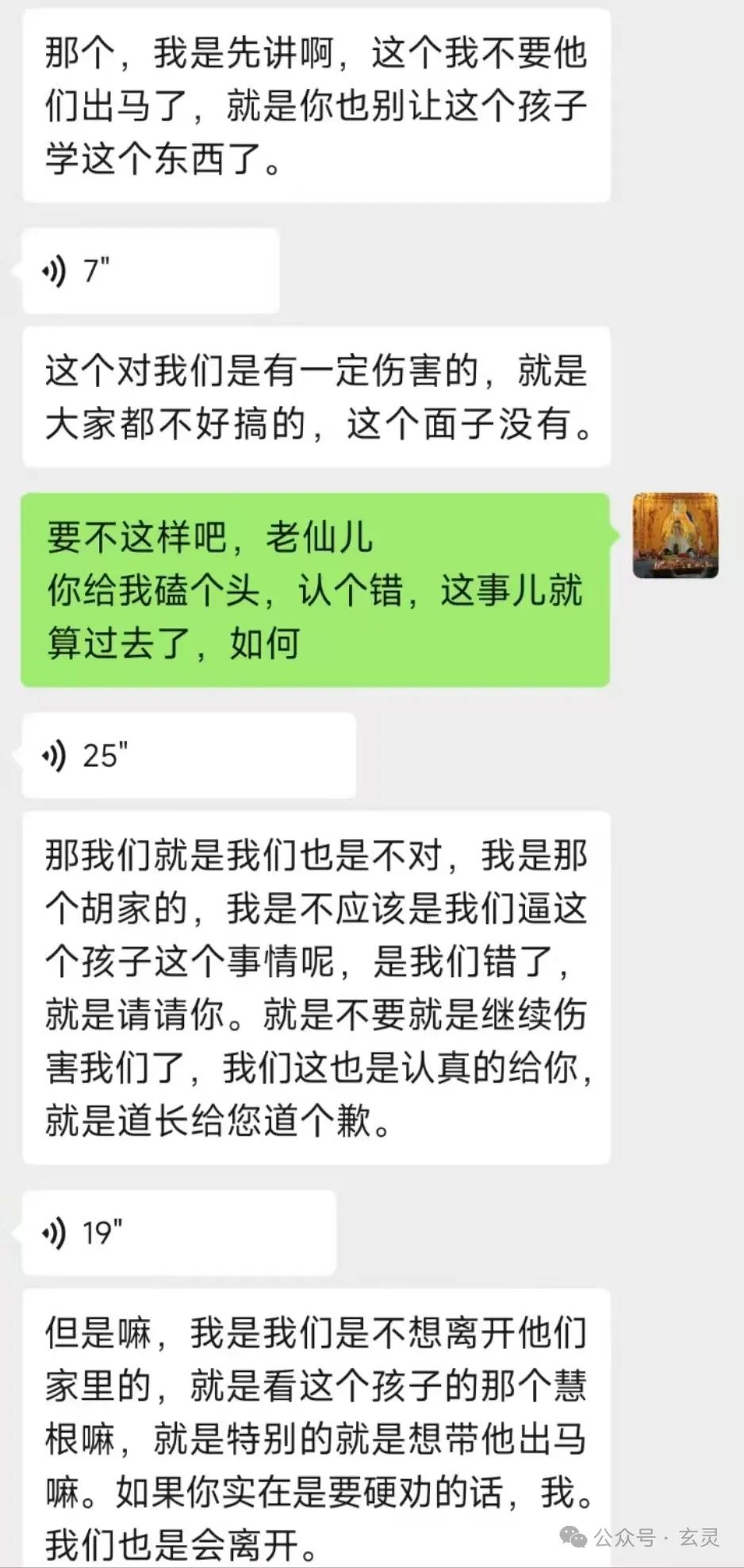 过了一会儿,一位受伤较轻老仙儿的再次上身。但比刚才谦虚太多了,让其跪下磕头倒也老老实实的认怂说“都是出来讨口饭吃。。。不要继续伤害我们了、我们真的给道长您道个歉。。。请您高抬贵手、我们也是真的知道错了,没想到能够麻烦您”之类的求饶,部分内容如图: