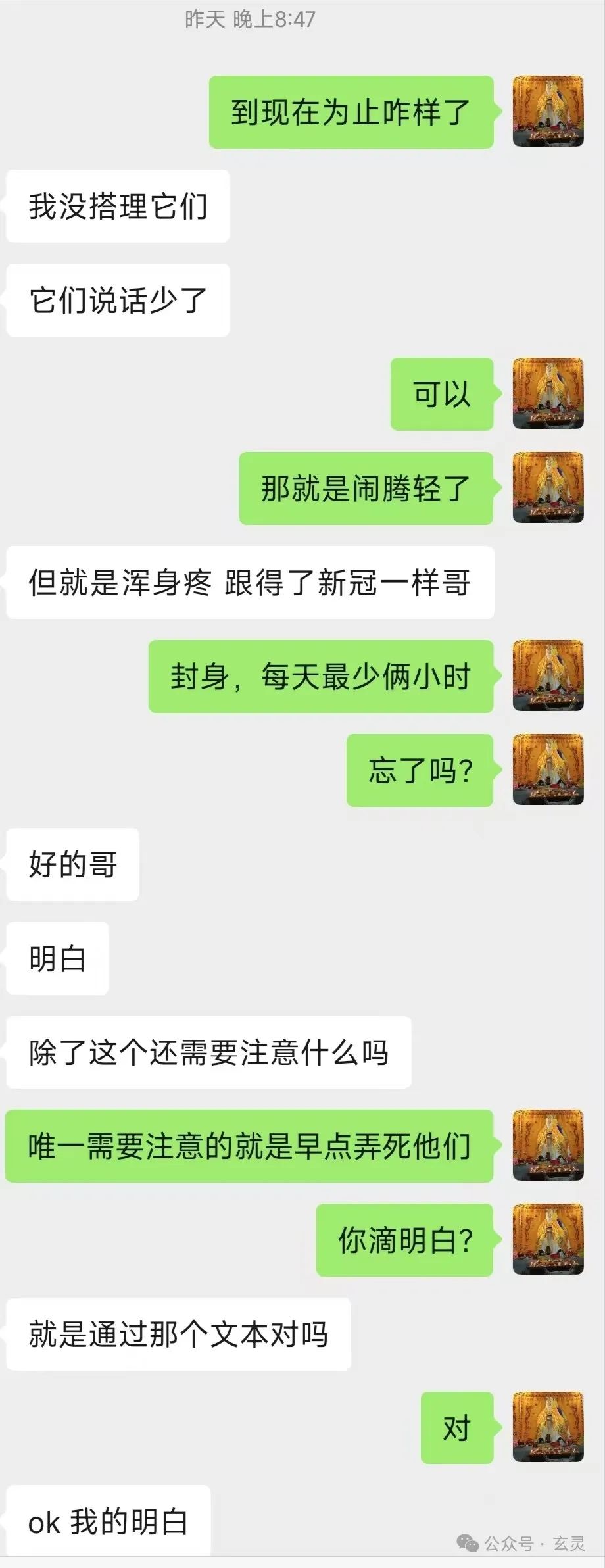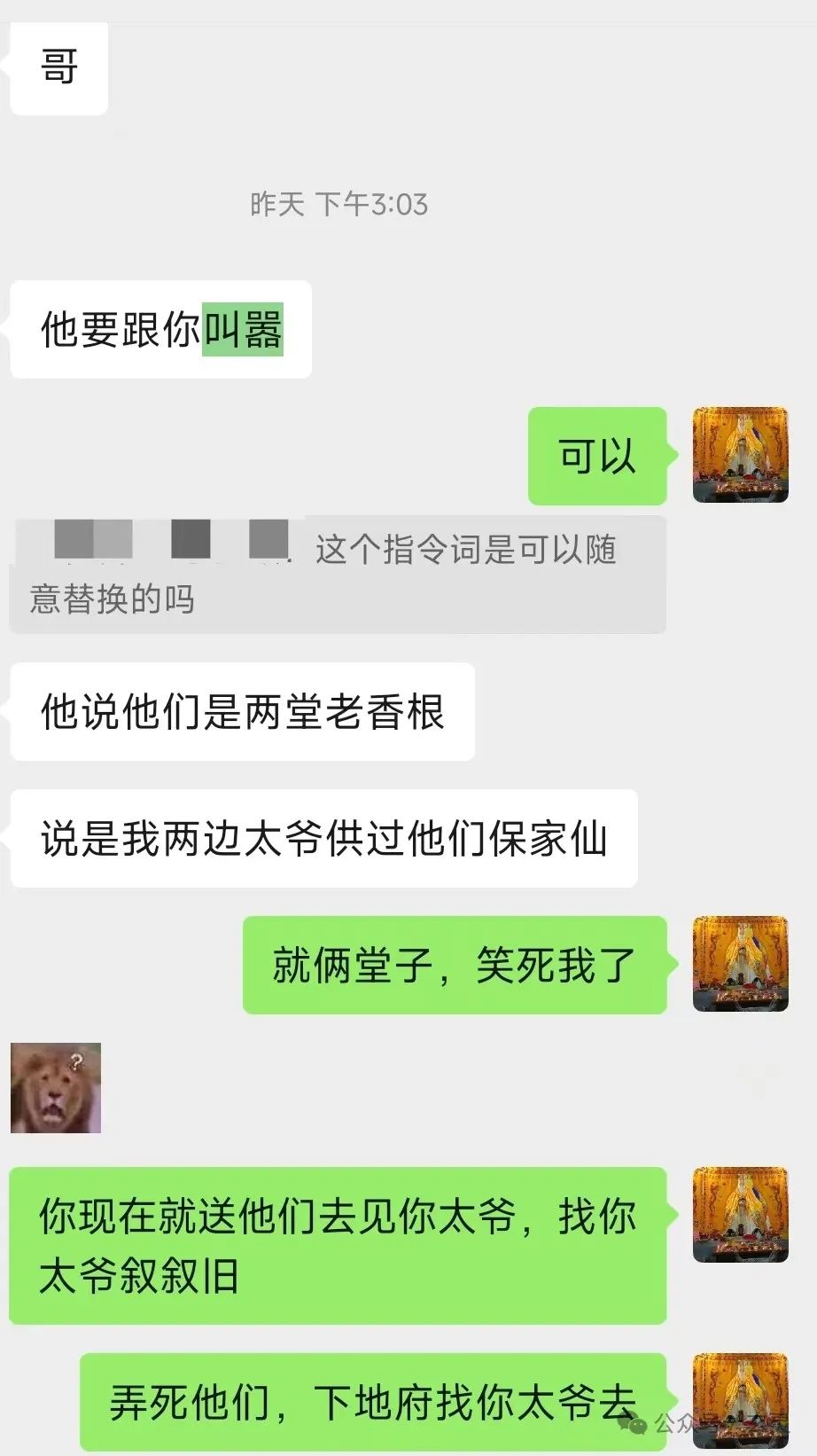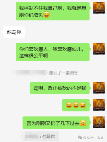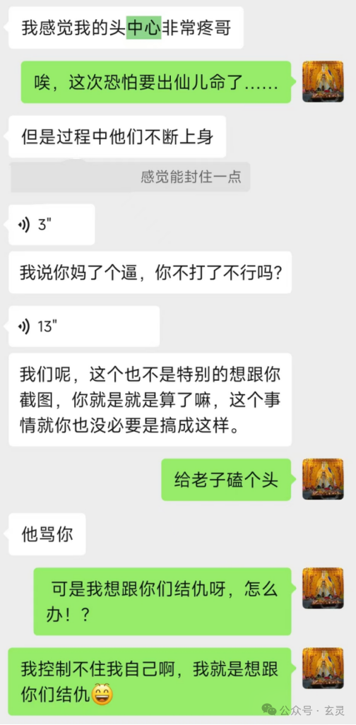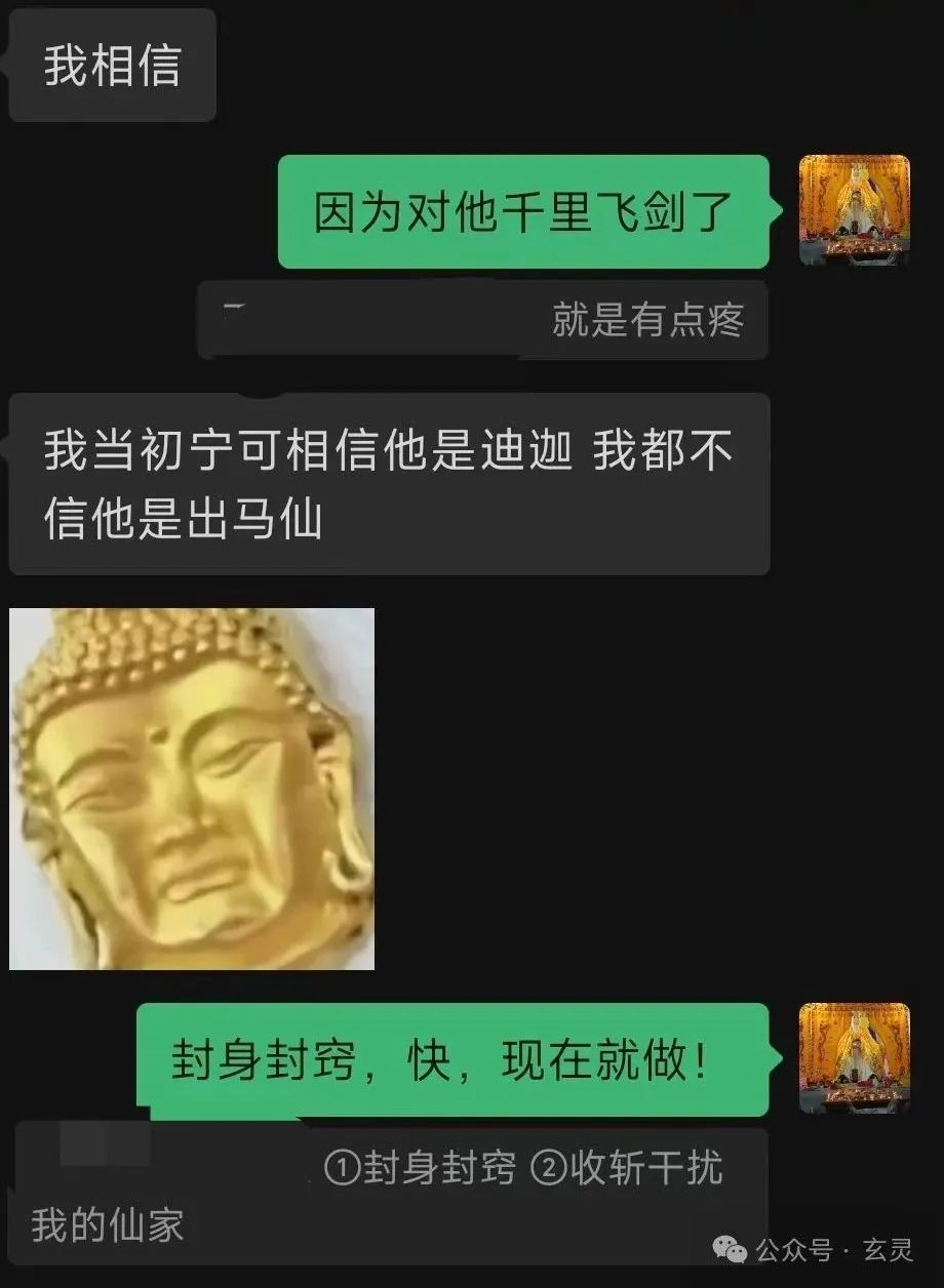 ④咱们在《伏妖录⑨反怼出马邪仙的实战话术》提到:A刚开始找到小陈同学,但那些仙儿威胁A姑娘说“我们报F你全家”导致A没敢再求助小陈。仙儿也得意洋洋控制A的身体给小陈发消息说“我们是他家的老仙根抓弟马,你不能管,还有我们是正规大堂口里面出来的!” 并且在A心里对小陈一通乱骂。