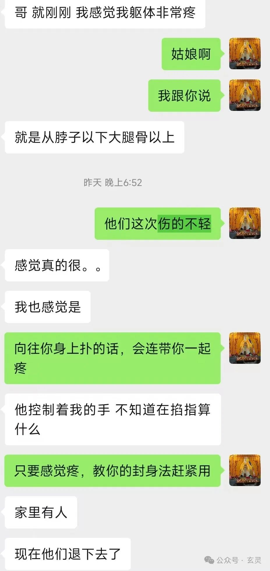 但A被常年附体,魂魄已经和仙家们搅在一起。只要仙家受伤、A也必然跟着在相同的部位疼痛,如图。