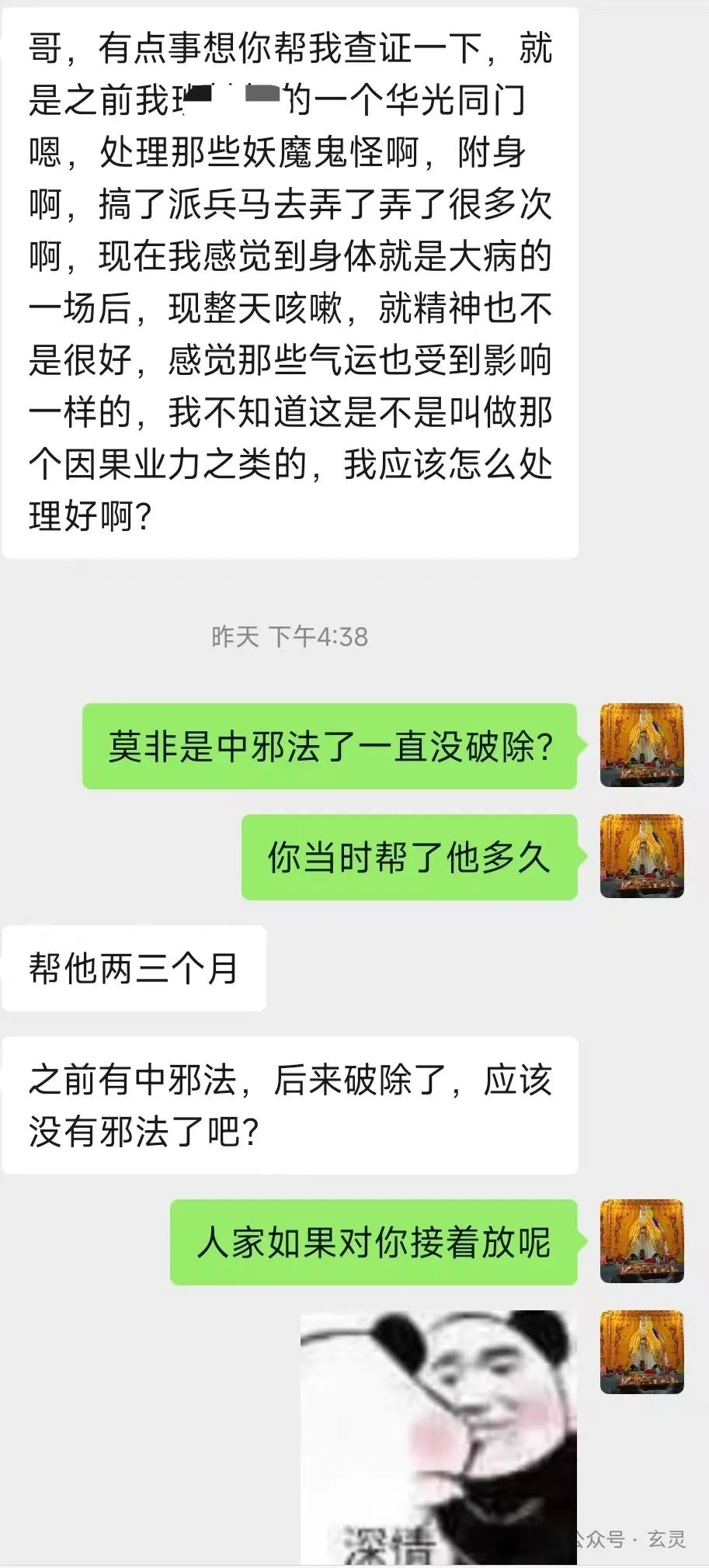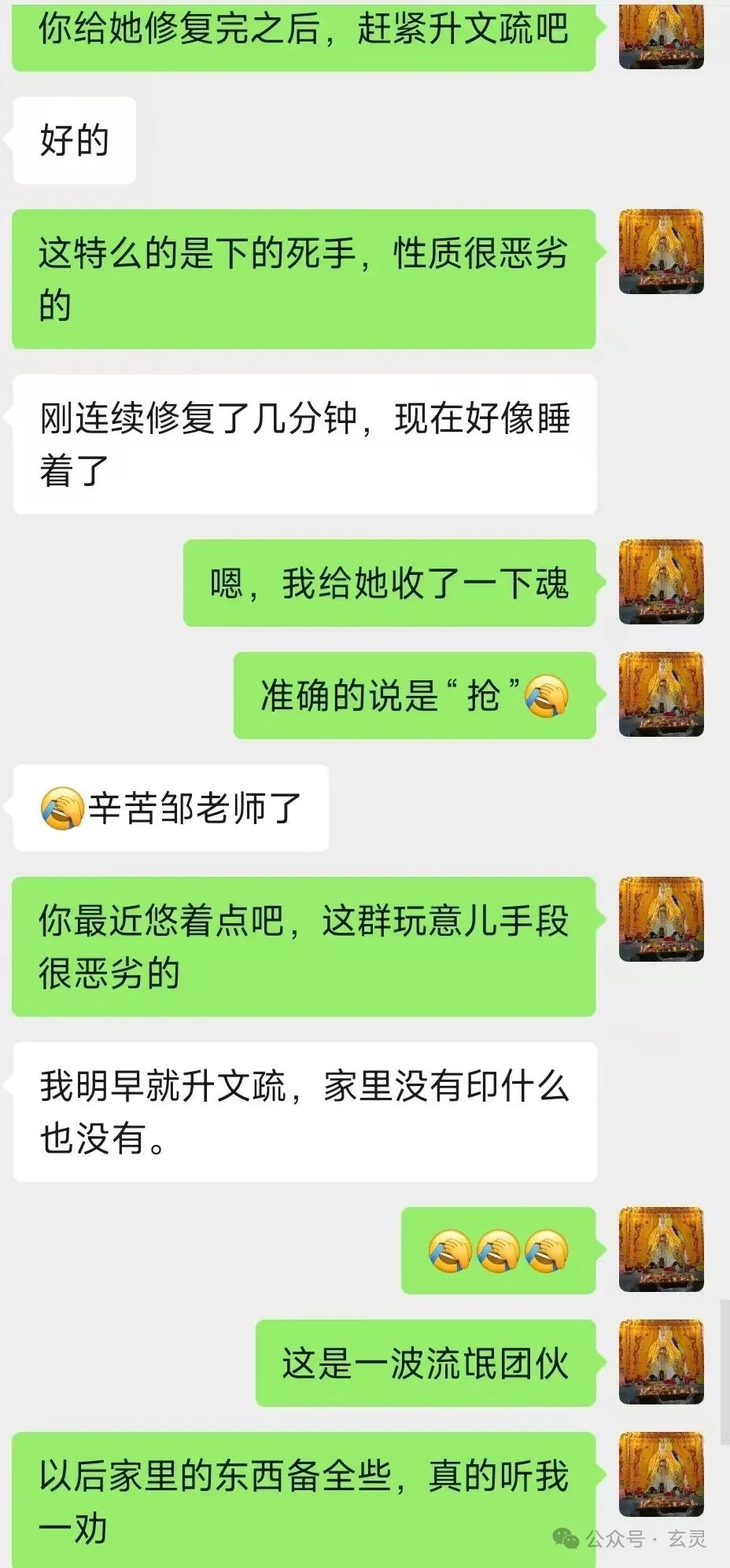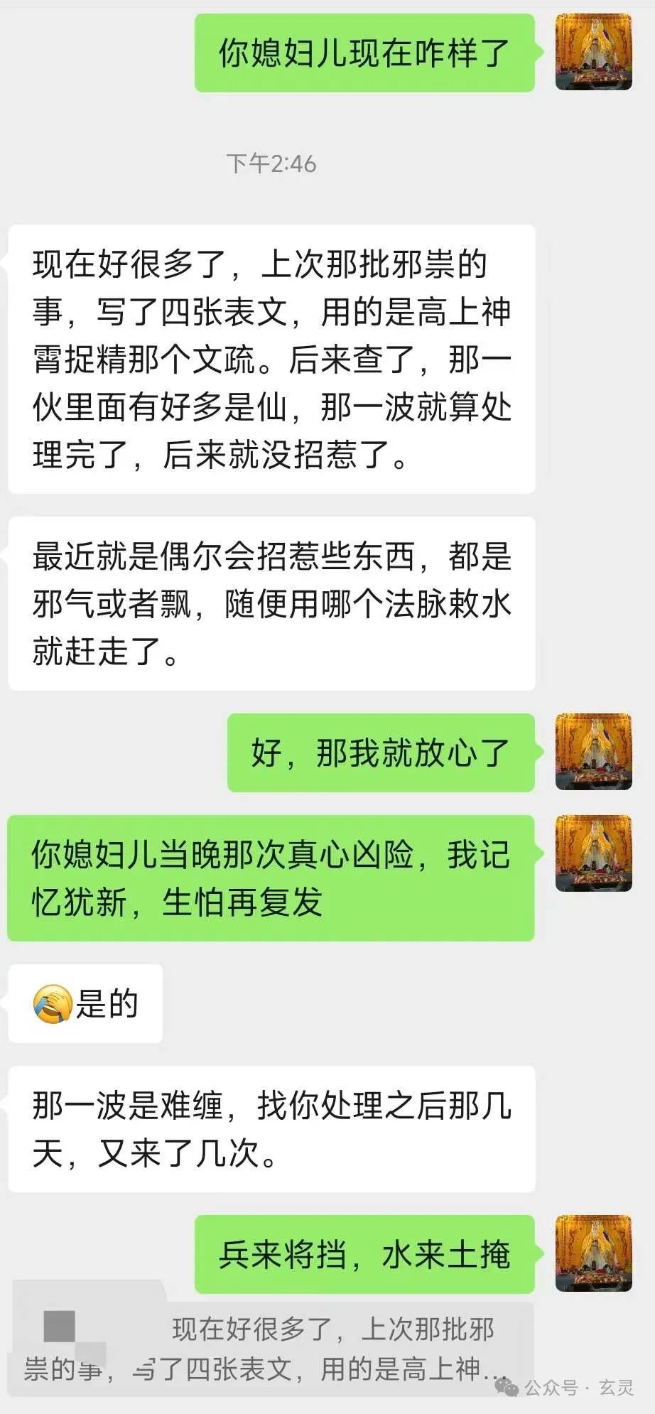 后来A哥一怒之下到咱们这学习武法。而后只见给媳妇儿祈请兵将驱邪+破邪法+修复魂魄这一套素质三连上去,各种情况往往几分钟就能压下去了。
