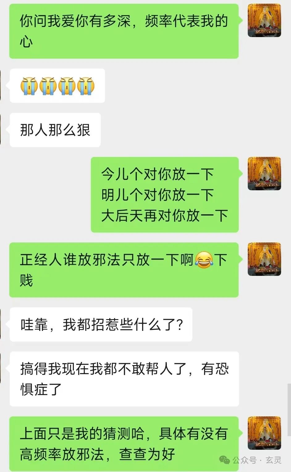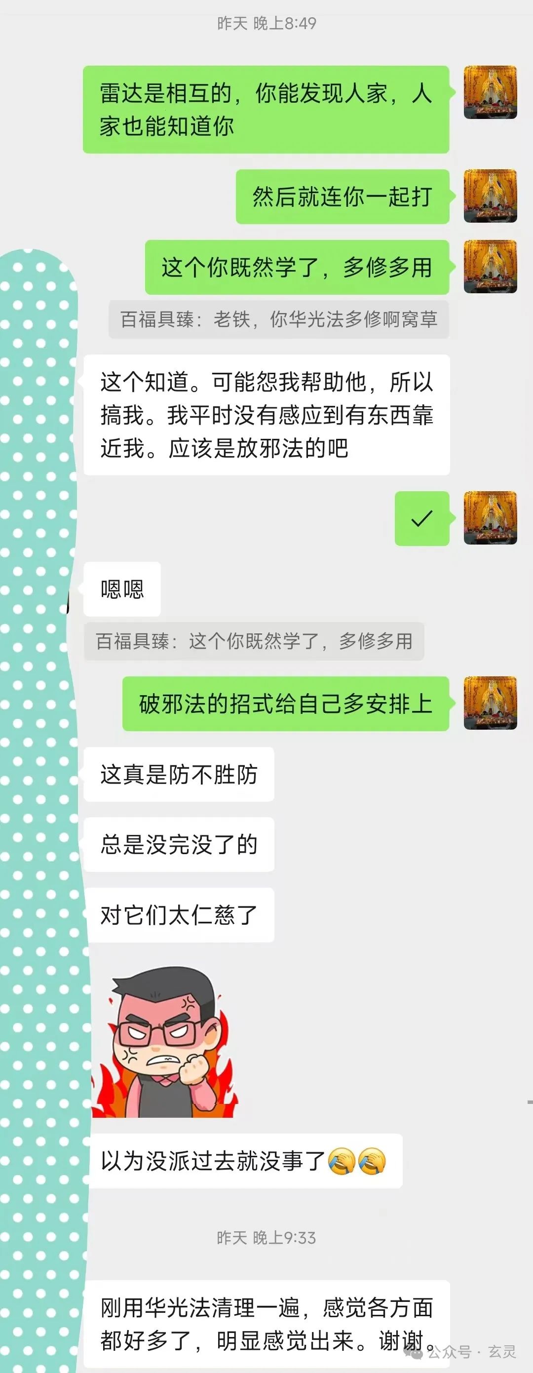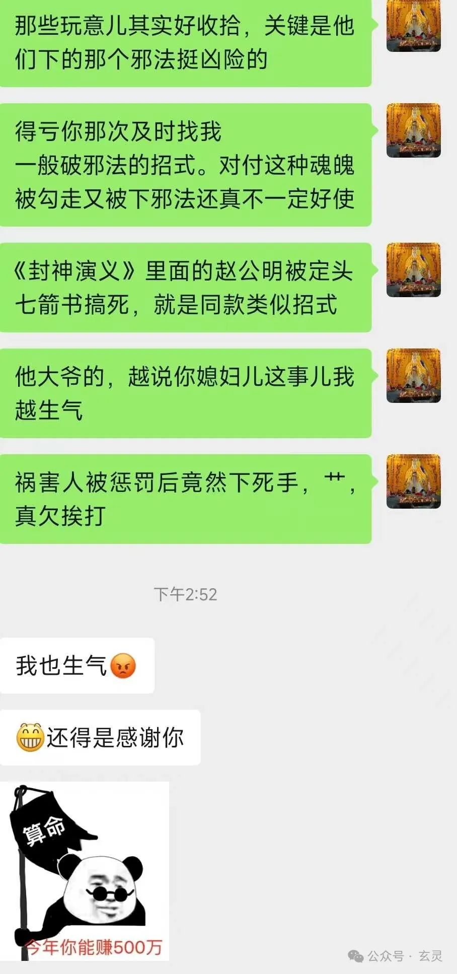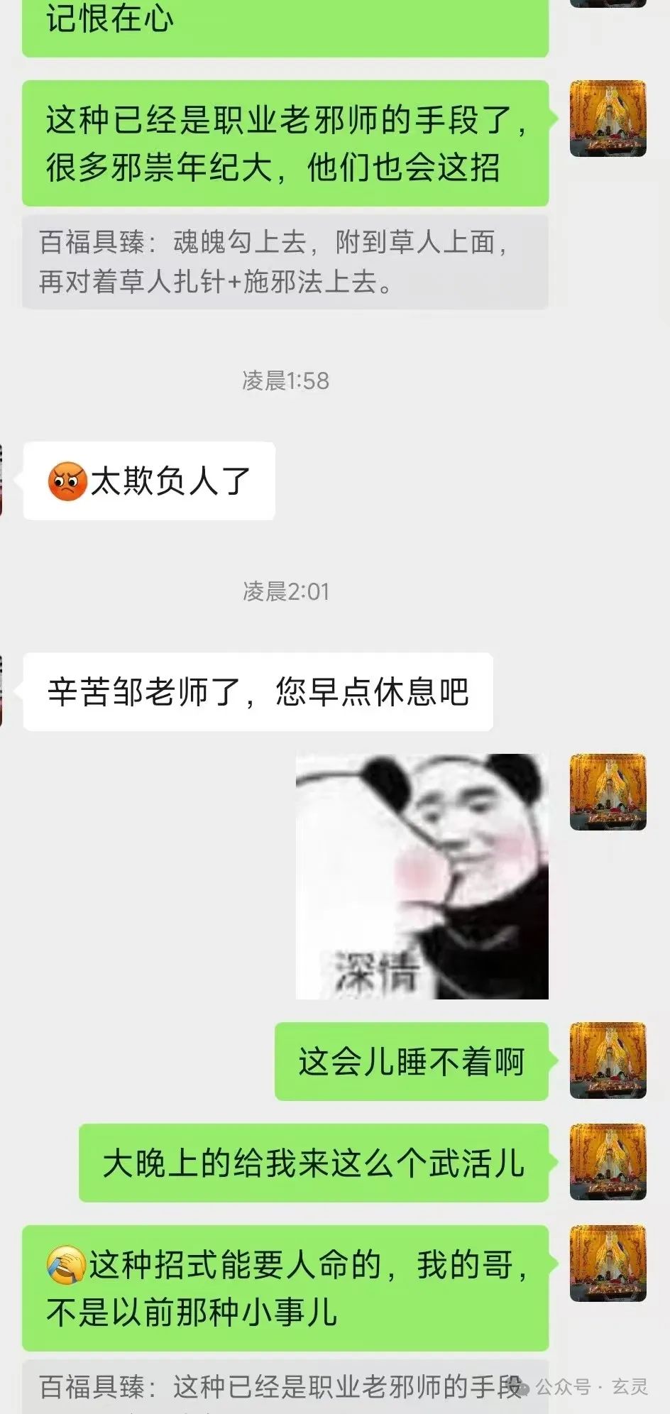 后来A哥一怒之下到咱们这学习武法。而后只见给媳妇儿祈请兵将驱邪+破邪法+修复魂魄这一套素质三连上去,各种情况往往几分钟就能压下去了。