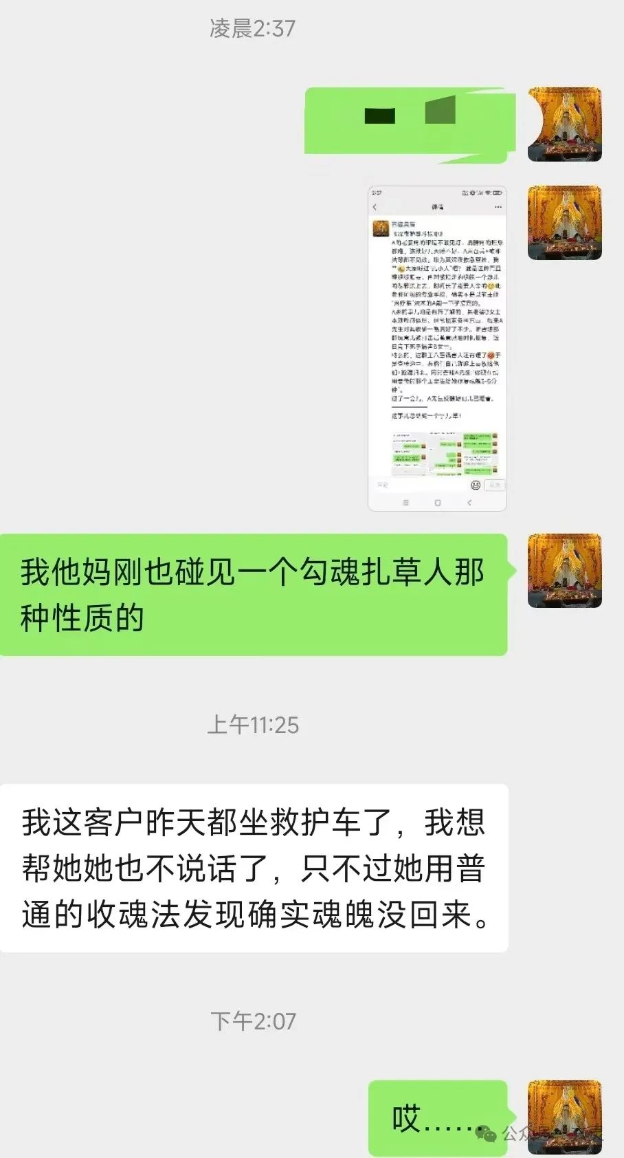 因为魂魄飘逸那种日常丢魂VS被恶意拘走的吊魂,收回难度就不是同一级别的。法理介绍完了,下面讲实战+解决思路,被害人最后成功解脱。