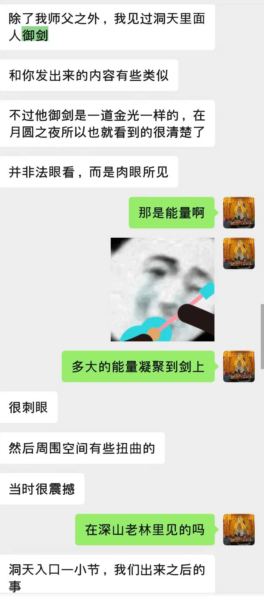 半年前,咱开全网首家武法陪练时,修丹道的颜老铁说要试试他剑指的内劲。其实当时来陪练的老铁走纯丹道路线的并不多,且打到身上威力多是不咋地。可唯独颜老铁打来之前连咱照片也不要,直接对着微信聊天框、须臾之间隔空切来几发剑指,咱身上瞬间有明显切割感(当然了,本身咱体感就比较敏感)。当时咱惊了一下,好家伙,传说中的丹道高手!