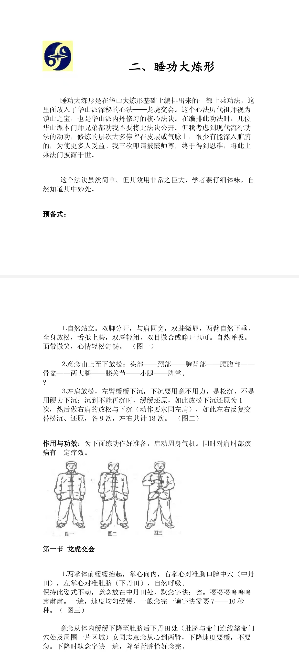 PDF第10页中间的《睡功大炼形》到14页的前4行,即下图所示,也即《睡功大炼形·第一节·龙虎交会》的所有内容。
