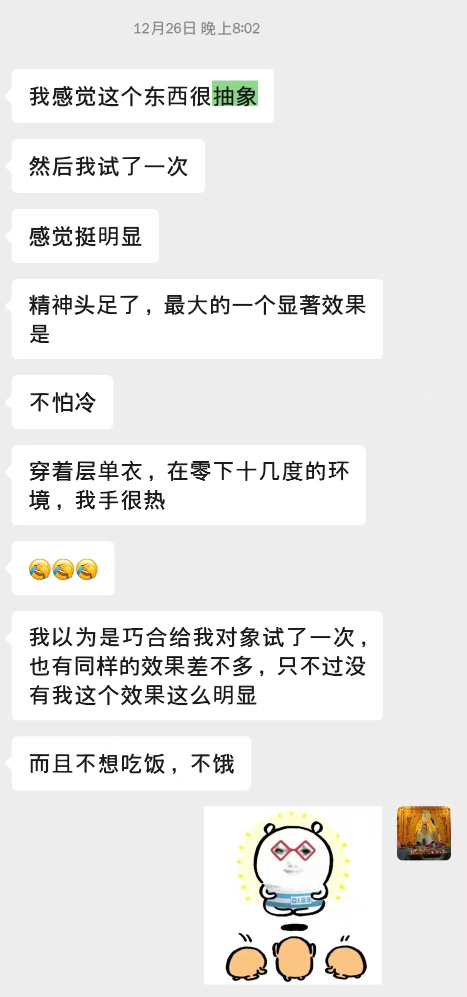 连续给别人治大病尚且如此,何况给本人增补精元?这里就不多吹嘘了,只透露一句:咱虽已中年,但现在的精气神远比18岁时好太多,无论是综合耐力还是整体免疫力,皆是如此。 期间结合咱催动天书的玉皇玉如意法,开启全网首家武法陪练,短短4天接了21位道友的近50招斩邪师法+打人惩恶法。纵如雨点般火力覆盖,也没见有啥事儿。详见《亲测各流派21位道友的48招斩邪师+打人惩恶法之威力与总结》