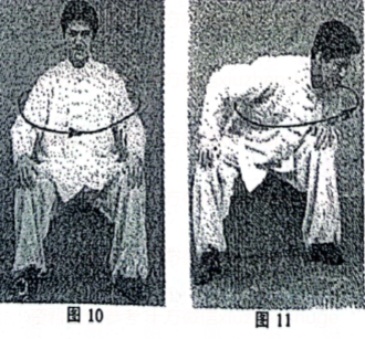 1.接上式,然后以腰为轴,逆时针方向旋转上身(以头带动上身画圆圈,如不倒翁一样),同时意念集中在腰部,呼吸自然,反复旋转不应少于3圈。接着朝相反的方向(顺时针)旋转同样圈数。做完后恢复预备式。(如图11)