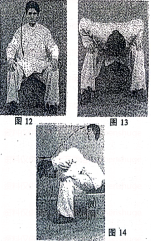 2.接上式。上身随自然缓慢的呼气前俯,当前胸接近大腿时静止,然后稍用力引颈前伸,百会前顶(仿佛拉开了颈、胸、腰椎间隙和肋骨间隙),然后抬头望正前方(只头动而上身不动),仰头之后,顺势随头、颈动作的还原而上身挺起。同时配合鼻自然吸气,吸气时小腹相应稍鼓起。上身恢复端坐中正位后,立即静止不动,闭气观想骶骨区6秒钟。接着自然的随口呼气而上身缓慢前俯。口呼→鼻吸→闭气→口呼为一次,反复修炼49次。(图12、13、14)