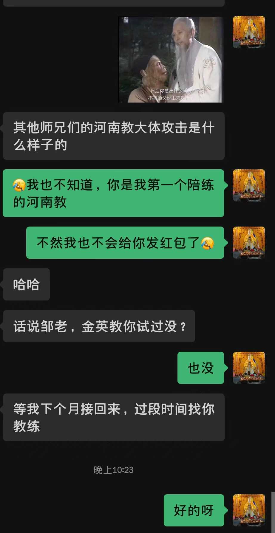 半小时左右来了一位打过实战的河南教老铁,而且是河南教里的绝教型。我一看,艹,这不老熟人吗?你学的有河南教咋不早说?干脆这次免费陪练,帮老铁实战一下这脉绝教的真实威力。当晚陪练后、现场写下这篇文章: