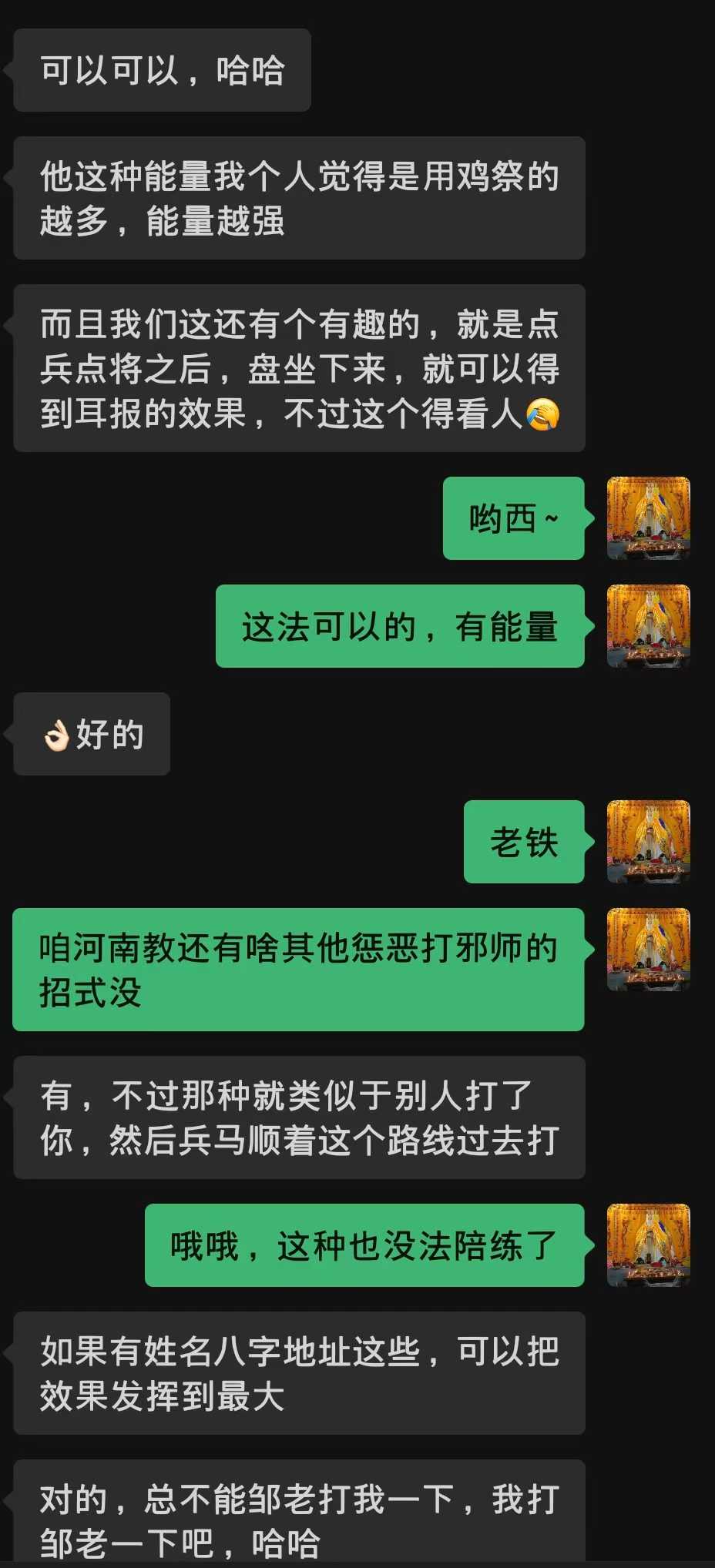 之前说可陪练兵马型武法,这次干脆请来西南法圈大名鼎鼎、江湖凶名曰“西南斗法第一”、专业玩兵马的河南教(绝教型)老铁整活儿,其几乎所有法都要请兵将与游师行法。 陪练分两个阶段,分别是主动惩恶+模拟实战。