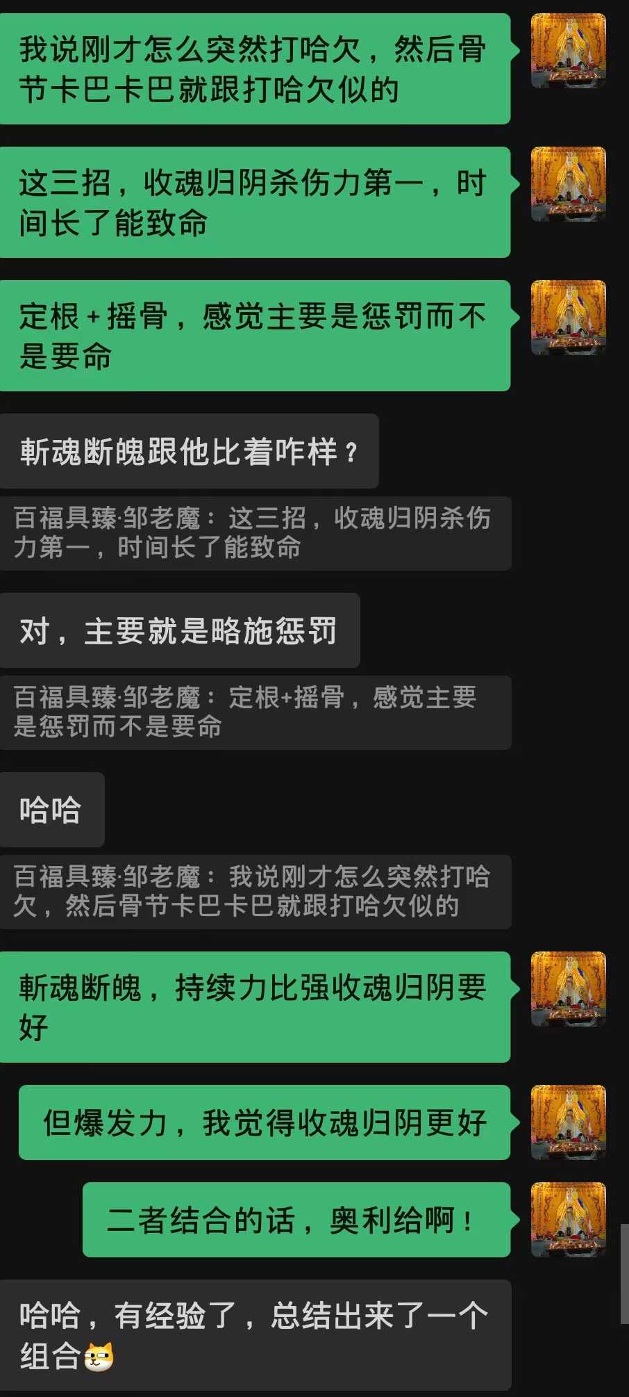 以上皆为个人体验。若有老铁对其中有疑惑,你也别找咱辩经,咱陪练时全程就一挨打的肉沙包而已,期间1毛钱的手都不还的那种,有啥感觉就说啥。你若硬问华光VS河南教要真干起来,谁撸的过谁?那我只能说看谁主场、谁客场、谁在理不在理了,双方上限都很高,哪位法师更得祖师神助=他更牛逼。