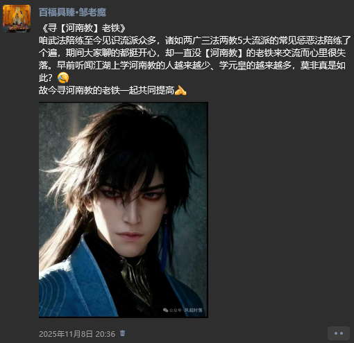 河南教,素有西南斗法第一的江湖美名、凶名、霸名。而本处作为全网首家武法陪练(详见《全网首家---攻击型武法有偿陪练,不限流派》),早已和两广地区大名鼎鼎的三法两教(华光、青罡、红莲、红林、十星)很多朋友们玩儿的火热,大家交流了很多经验,却一直没等到河南教的弟兄们来玩耍。故2025年11月8日,咱发个朋友圈摇一下河南教的弟兄们。