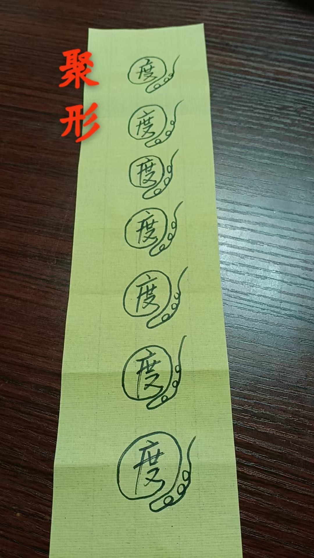 此符,每念一句咒就画一笔,一遍完整的咒(总计10句,对应10笔)就是一个字,七个字就是完整的一道符,如下: