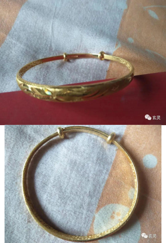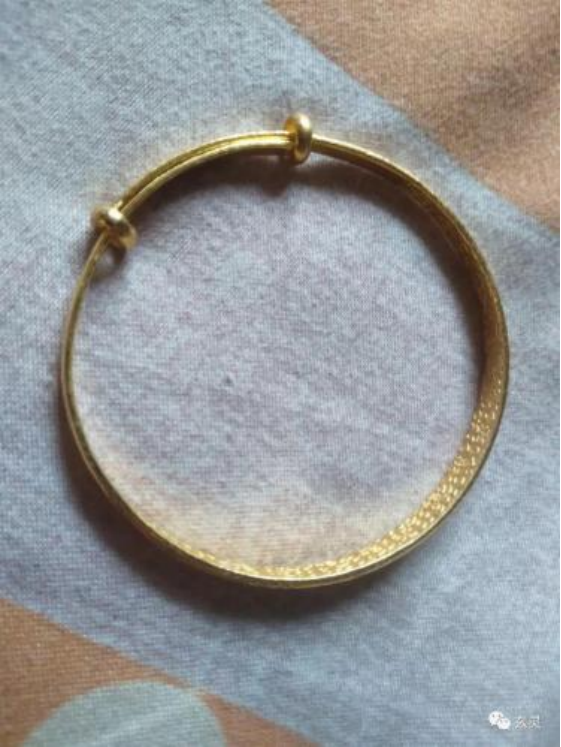 大人随即就找路子把其中一点金子换成了粮食、粮票之类的,如此就把那一次饥荒挺过去了。最后就把剩下的金子打成了戒指、镯子、项链之类的保存到刘姥姥那里,接着又传给崔妈妈。但随着时间推移,家里困难时就逐渐把这些金首饰卖了,目前只剩下一个数次回炉锻造的金手镯保存在崔妈妈手里,如图: