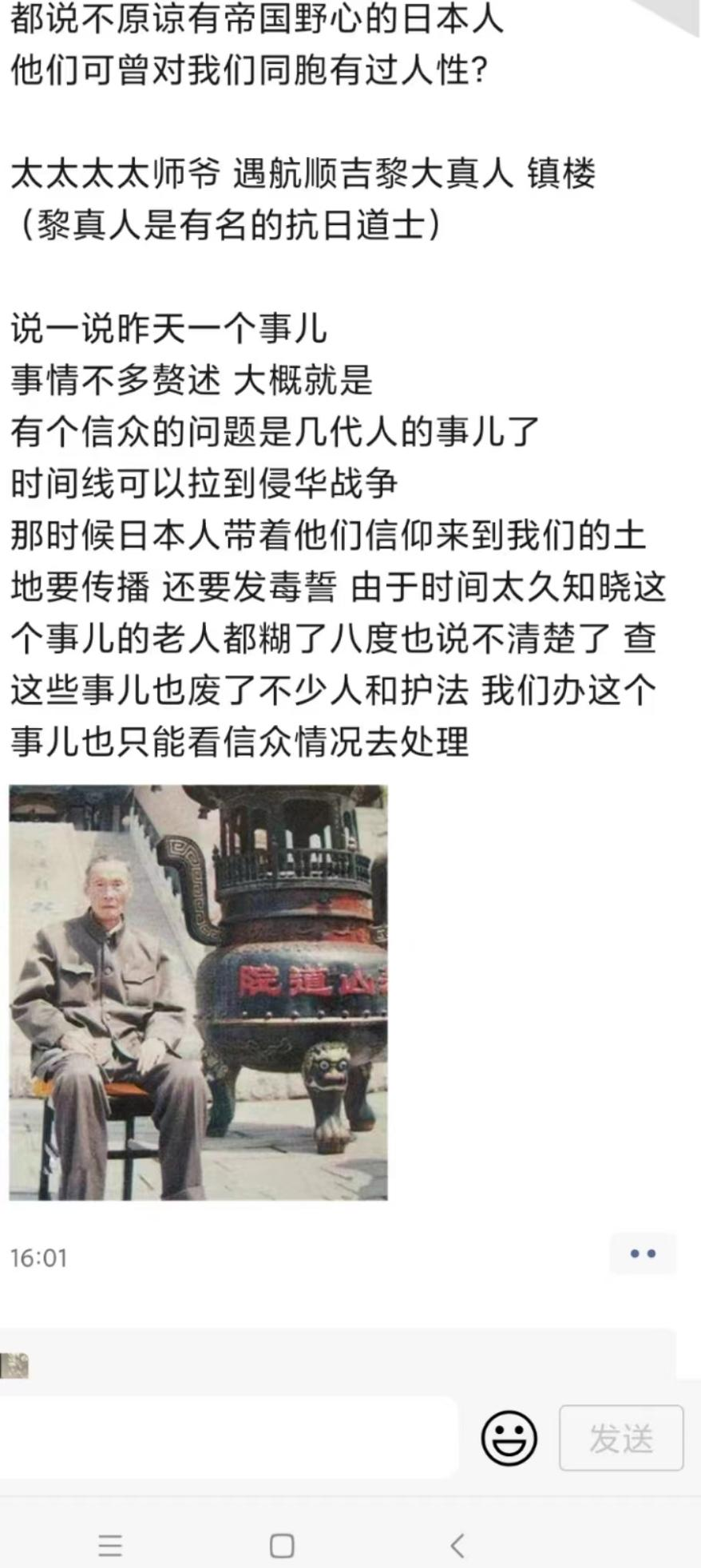 当年脚盆鸡在1937年攻占北平之后的七八年时间,专门有一支部队逼着被他们选中的老百姓去信脚盆鸡那种不正经的教,且被逼着发毒誓。而这些老人或是自身(年龄最大的九十多岁那位老爷子)或是六七十岁老人的父母辈,当年全都有被逼着信那些神叨教的经历。