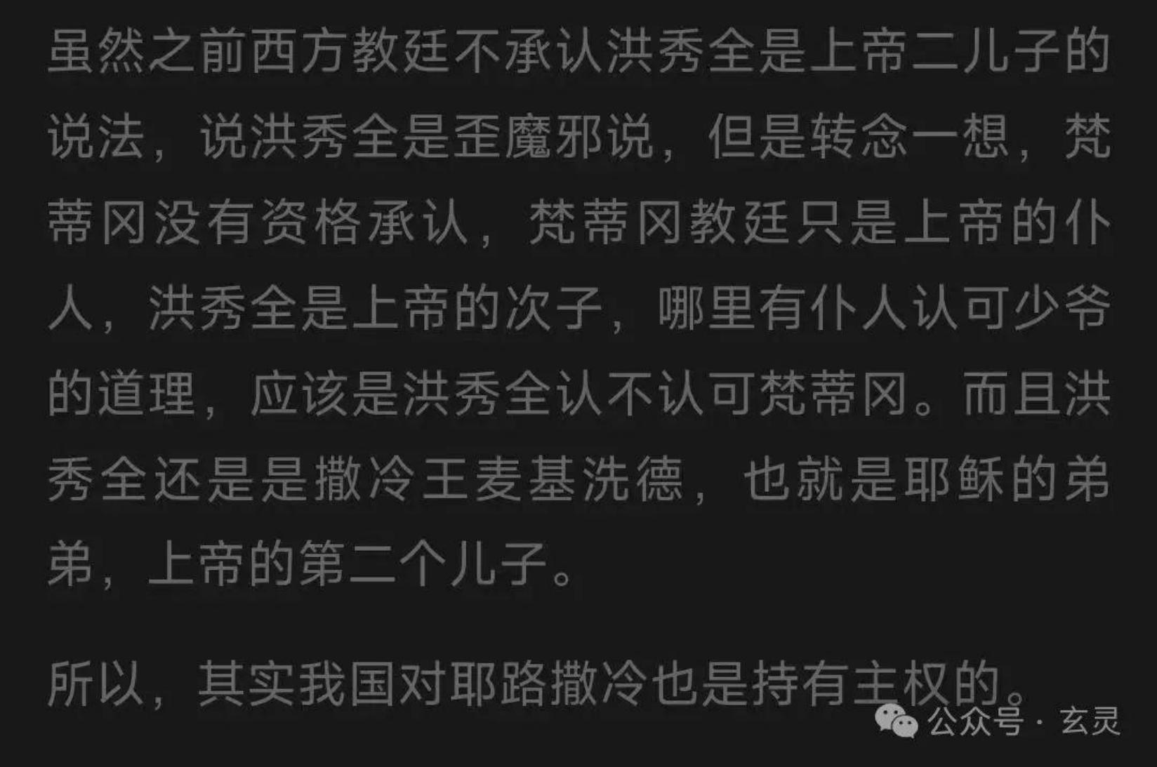 答:“耶教正统传承,实际在我泱泱华夏。当年洪秀全洪天王自称God的二儿子其实确有此事,故我们的传承比你们现有的更灵。而今全球耶教之祖庭不在梵蒂冈,实际在我华夏之三自爱国协会是也,Welcome to Beijing!”。