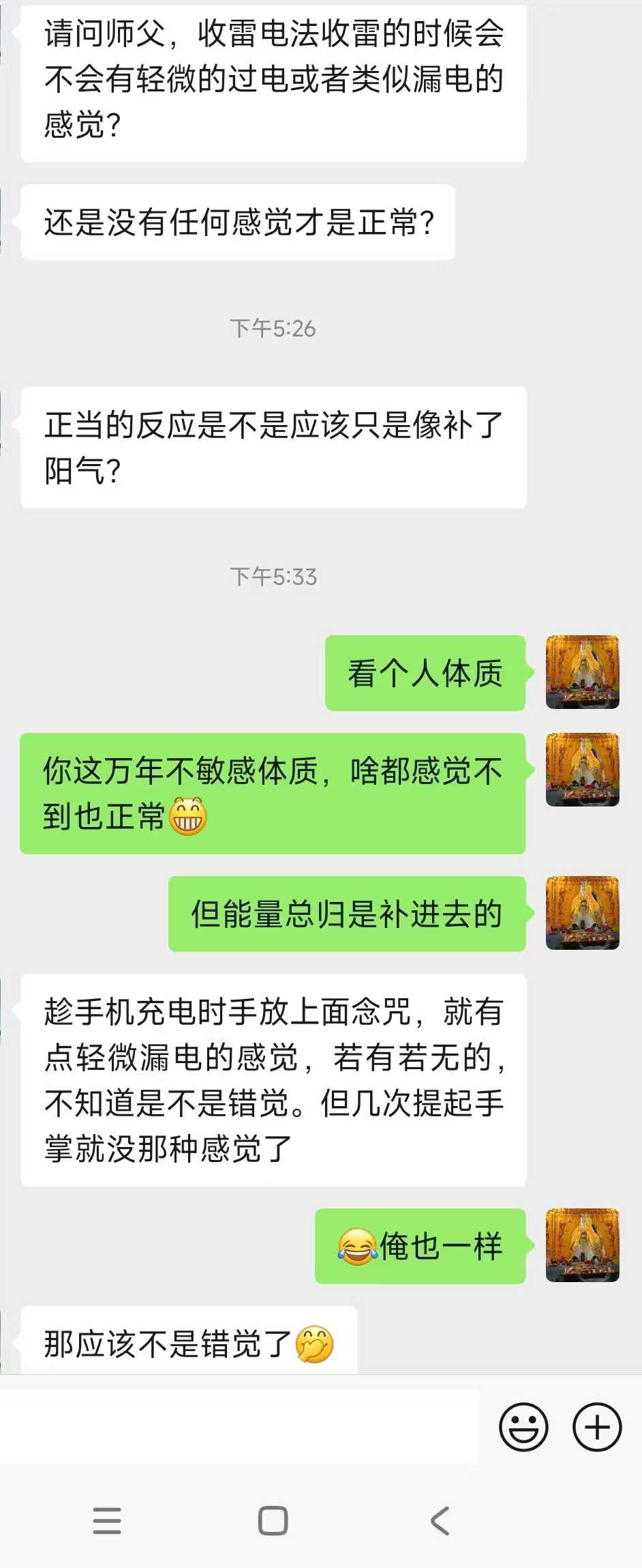 话说近日传的收雷电法,让这位小六十岁+万年不敏感体质的老铁现场体会出电流感。咱传法,很多东西都是自己亲自验证过的,不然你连教学都不知道怎么教,堪称一问三不知。