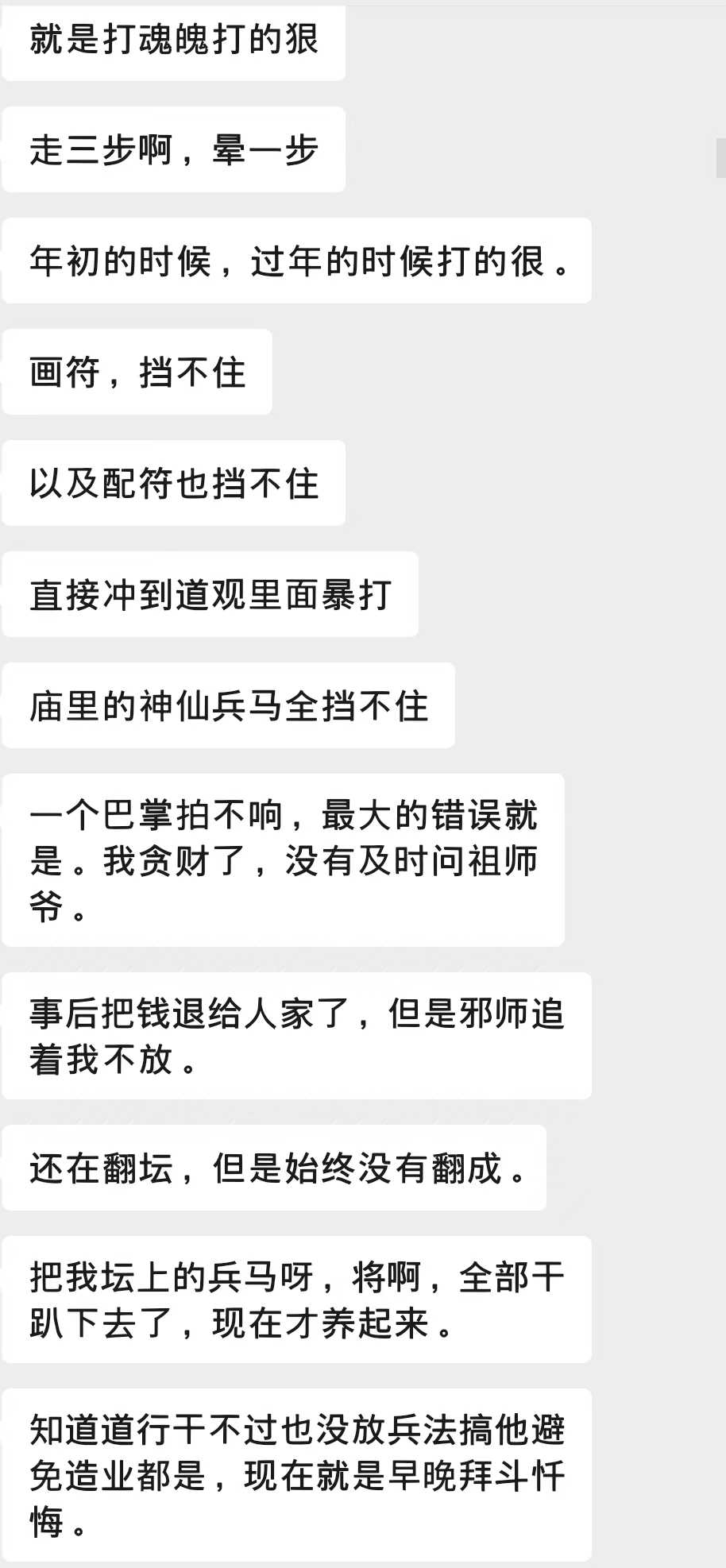 话说A哥是某道观正经授过箓的道长,曾祈雨灵应一方,听其将班也是老神霄的法。年初A哥帮善信家破邪法反受其害,当时被邪法打的整天头晕无力、甚至后背疼半年至今。期间各种防御手段全部失灵,甚至在道观里都被打穿,有快被打死的感觉。如下: