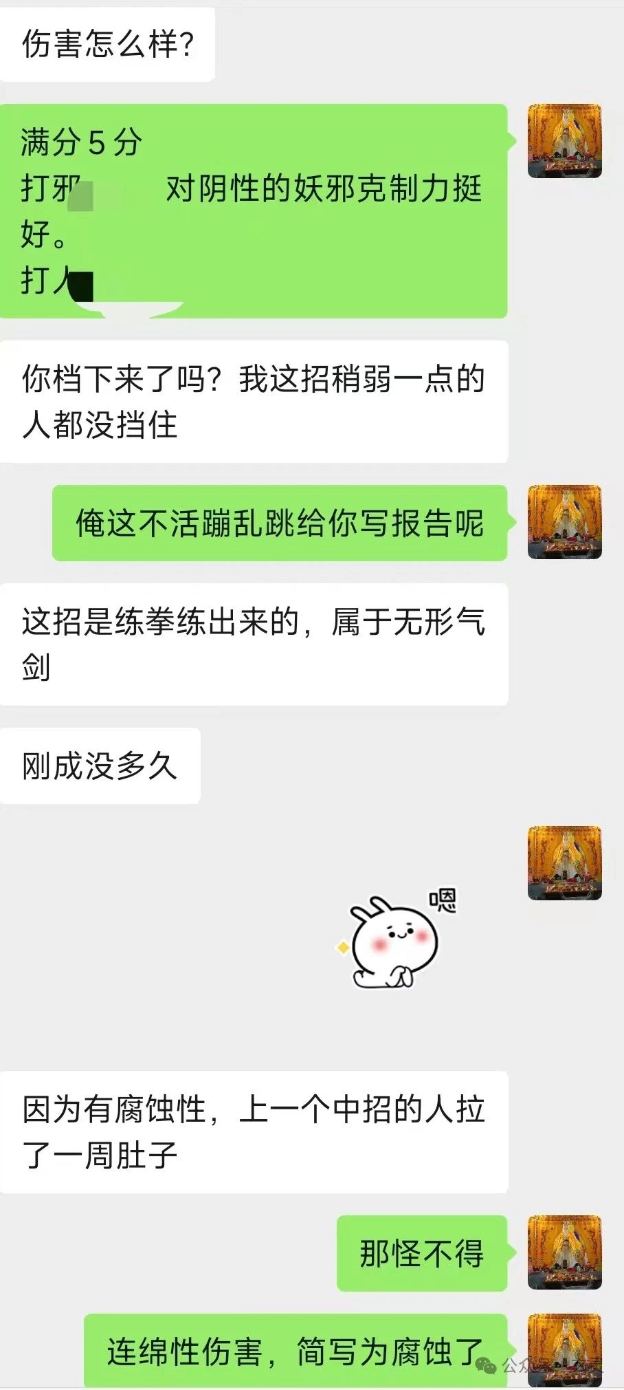 昨天陪练时为了让大伙儿们尽量逼近实战,让老铁打之前务必心想“屏幕对面是个无恶不作+骗了我钱的老邪师,今天一定要咔嚓了他”。相比平静的心情,如此打出去威力高很多,总之放武法时一定要有怒气。