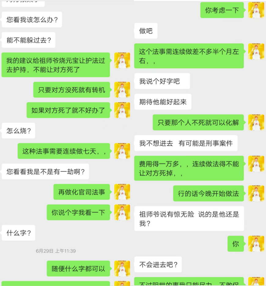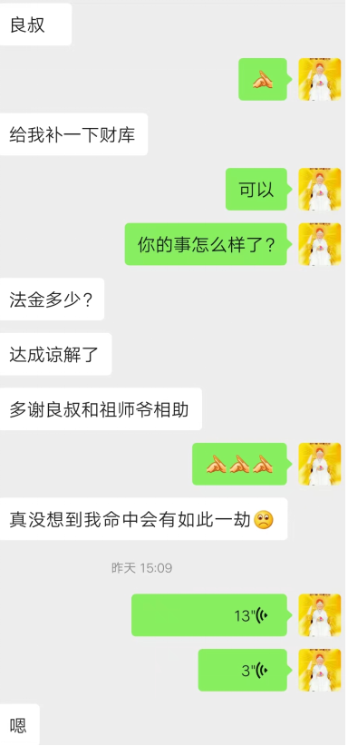 转眼到了2020年,咱们遇到一位商人自称前些年做生意遇到纠纷,资金量数千万级别,现在警方上门要问事儿。本想给他用这一招时,祖师却说因果大,仅仅化解咱们背的因果就要用5万元人民币拿去给神灵建庙才能化解的完。所以就没给他用,因为扛不住啊!看似几十块钱买点中药就能化解各种官司,实则背后涵盖了这么大的因果。所以后来咱们就很少给人用这招了。